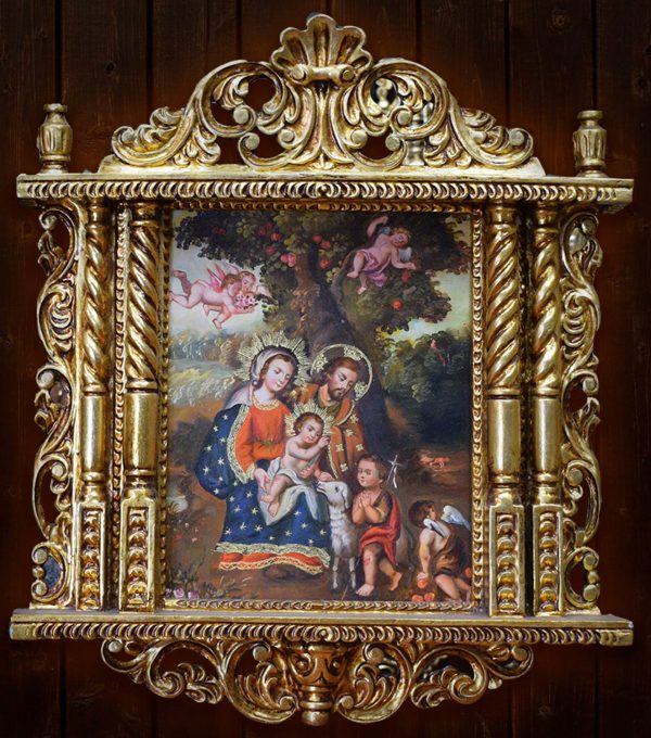 La escena de la sagrada familia, tiene varias representaciones en la escuela cusqueña. En este lienzo se observa el reposo de la sagrada familia acompañado de danzantes querubines.