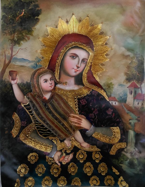 Representación de la clásica cusqueña virgen andina acompañada del Niño Jesús, en un acto de consagración, Jesús lleva en su mano un vaso con su sangre, haciendo referencia a la eterna presencia del acto de comunión.