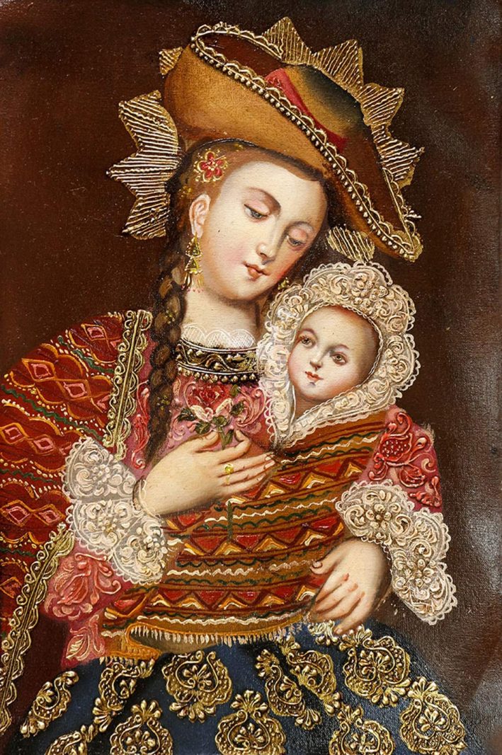 Representación de la clásica cusqueña virgen andina acompañada del Niño Jesús, en un acto de consagración, Jesús  esta envuelto de un manto andino con colores representantes de la zona y tejido singular.